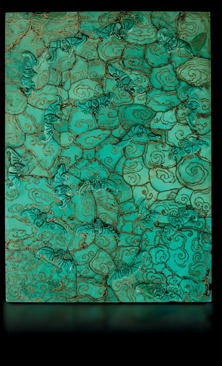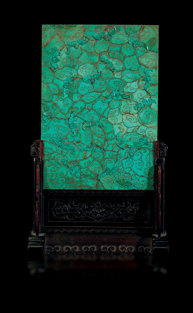 Importante e raro paravento imperiale da tavolo su stand in legno con placca finemente scolpita in turchese con dettagli in oro raffigurante scena di vita comune entro paesaggio e figure di pipistrelli, Cina, Dinastia Qing, epoca Qianlong (1736-1795)