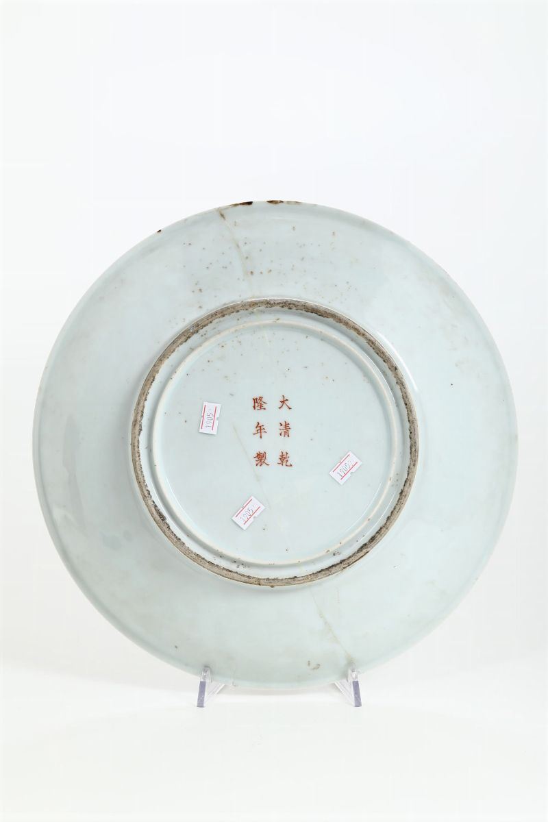 Lotto composto da due piatti in porcellana a smalti policromi con decoro di draghi tra le nuvole sui toni del rosso e del [..]