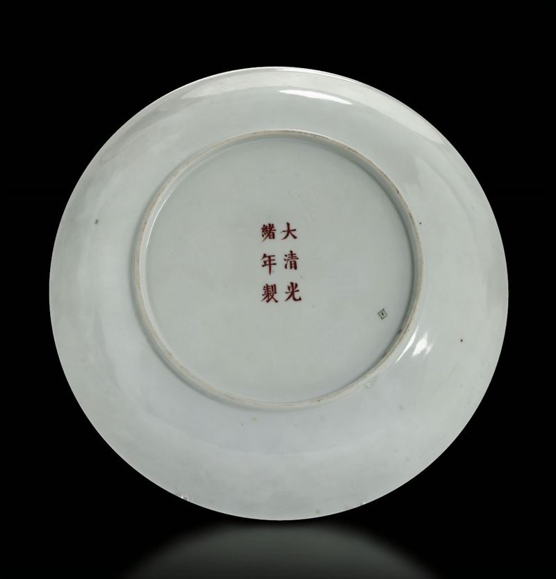 Lotto composto da due piatti in porcellana a smalti policromi con decoro di draghi tra le nuvole sui toni del rosso e del verde, Cina, Dinastia Qing, epoca Guangxu (1875-1908)