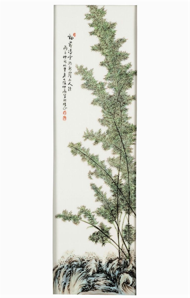 Lotto composto da due placche diverse in porcellana a smalti policromi entro cornici in legno con raffigurazioni naturalistiche e iscrizioni, Cina, XIX-XX secolo