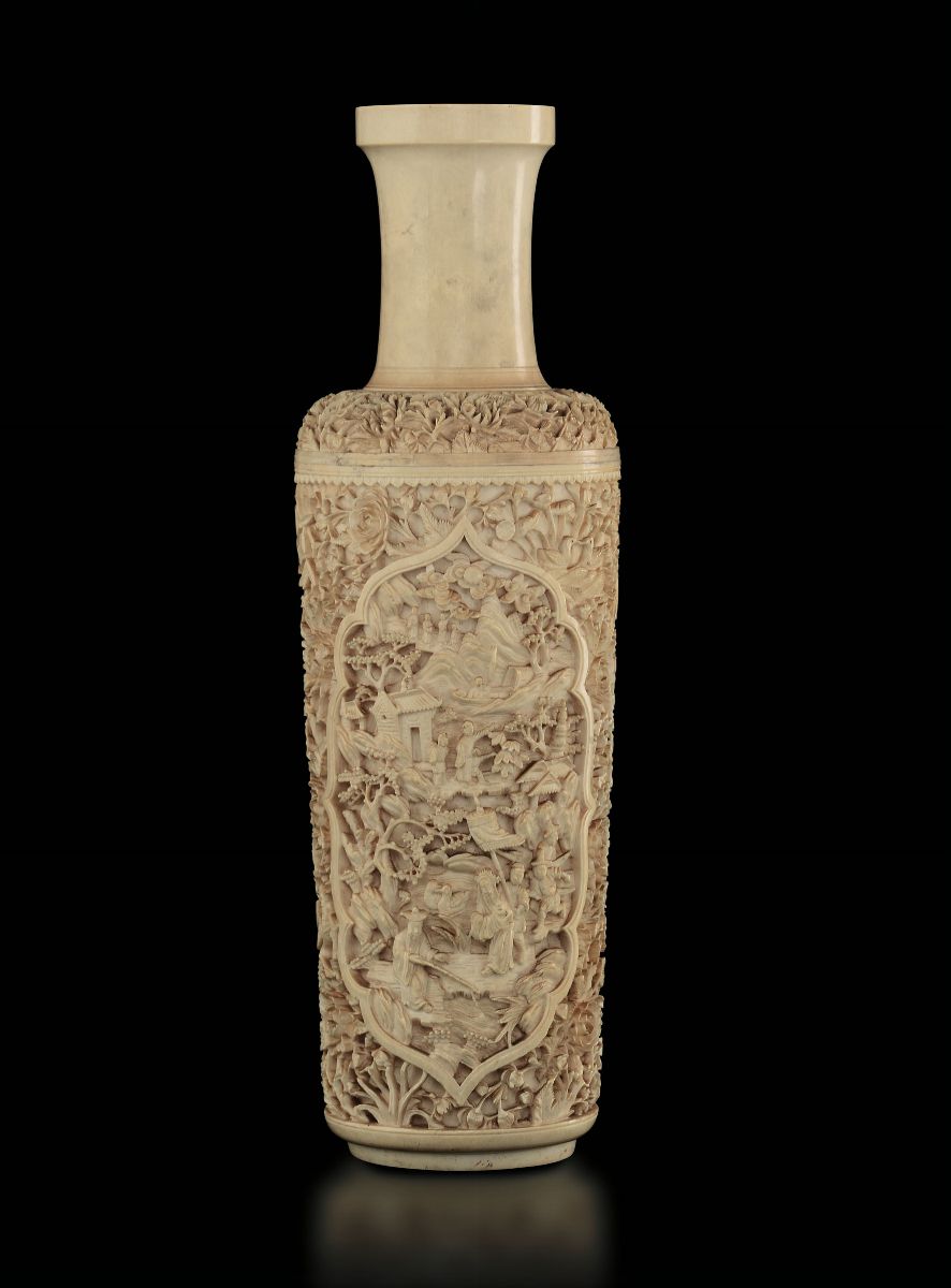 Lotto composto da sei sculture in avorio con personaggi e vaso scolpito in osso con decori floreali e scena di vita comune, [..]