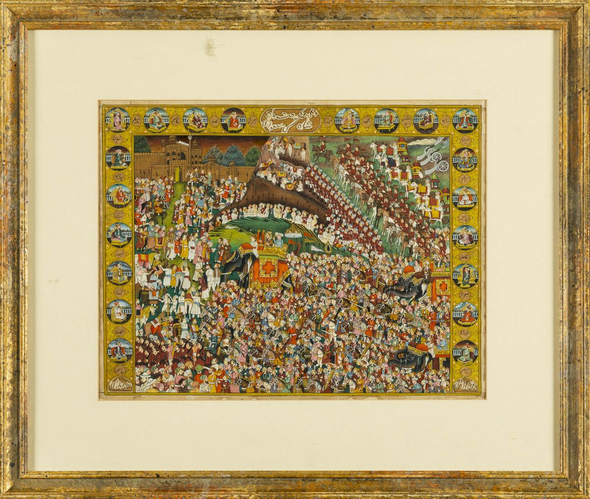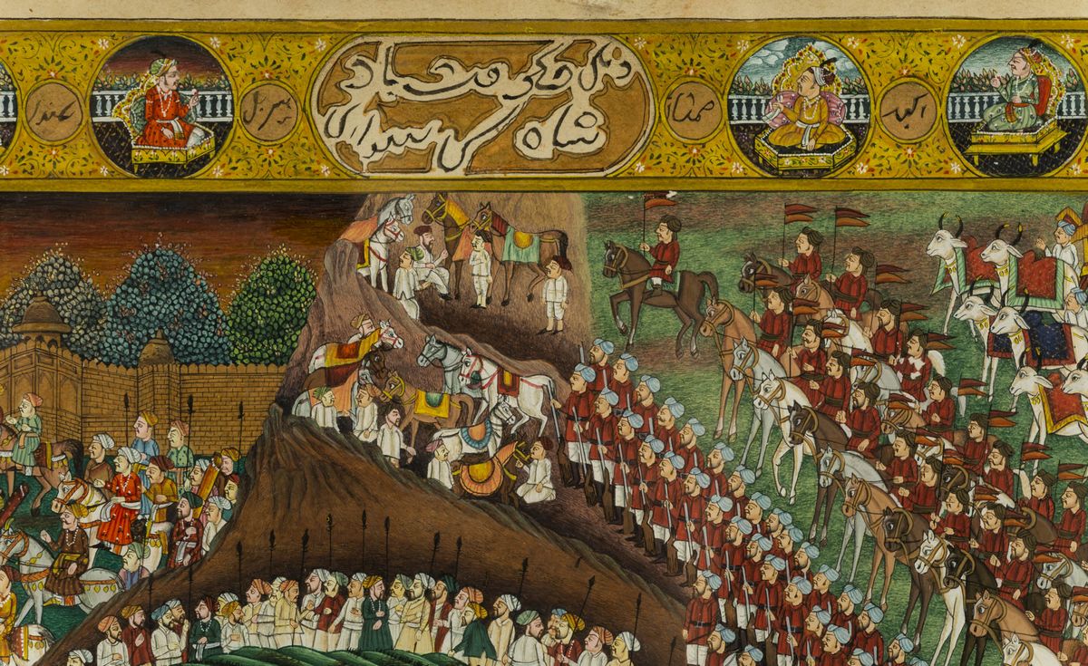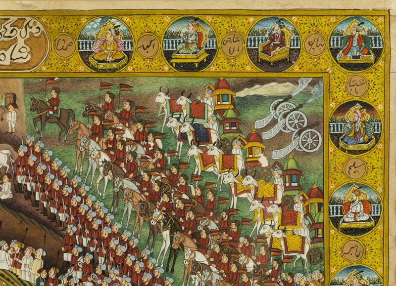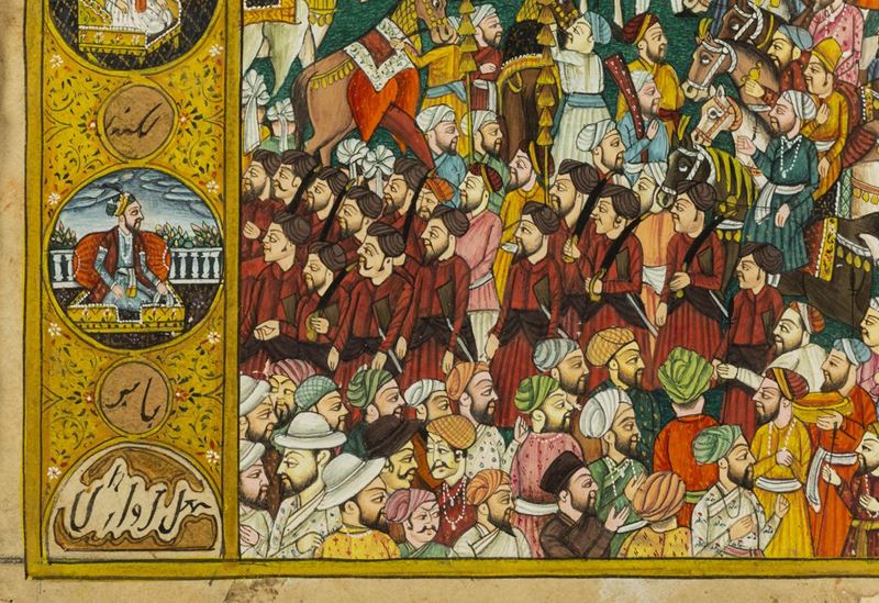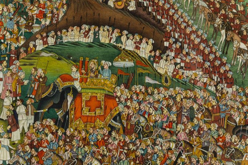 Miniatura su carta raffigurante corteo con personaggi a cavallo ed elefanti, India, XIX