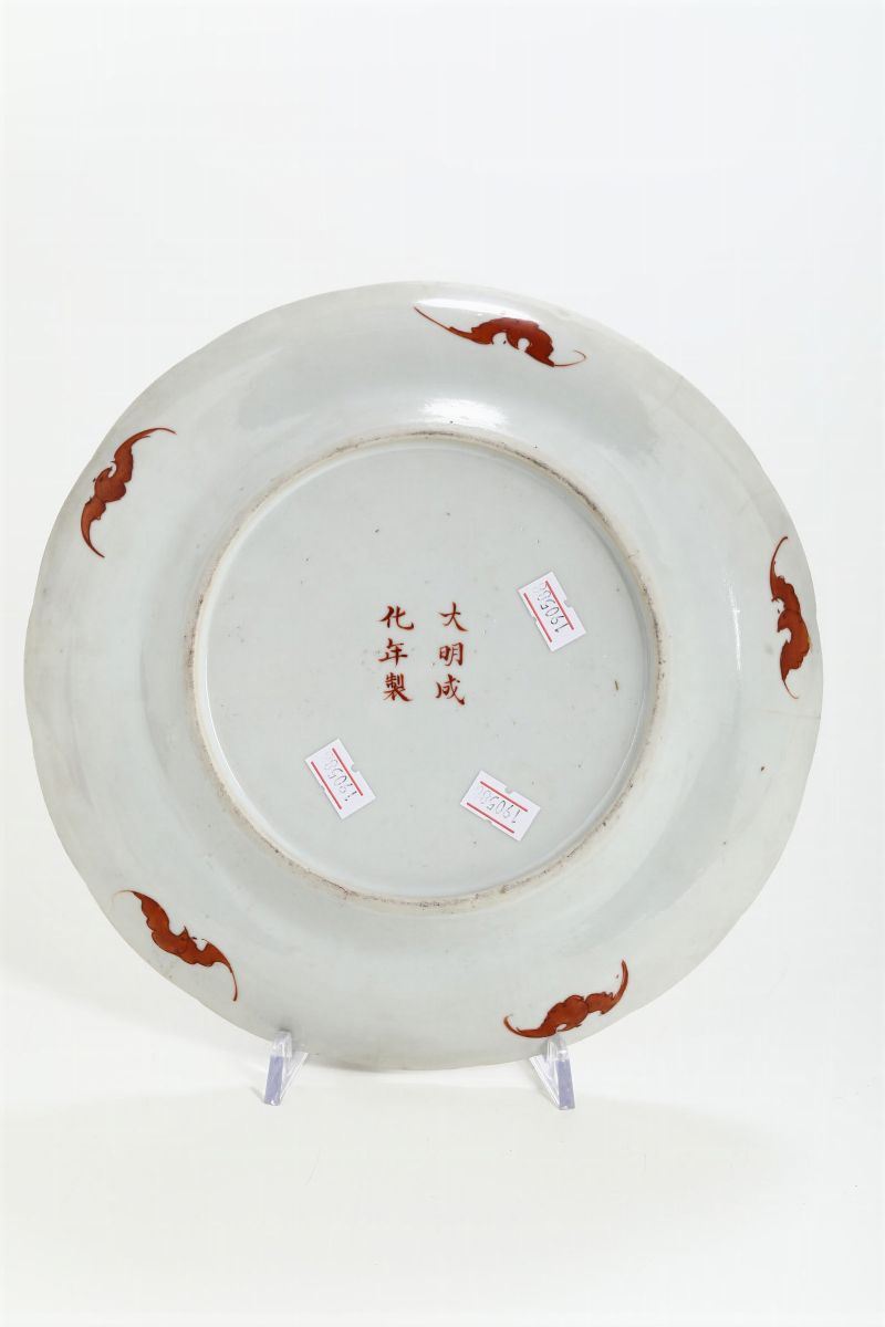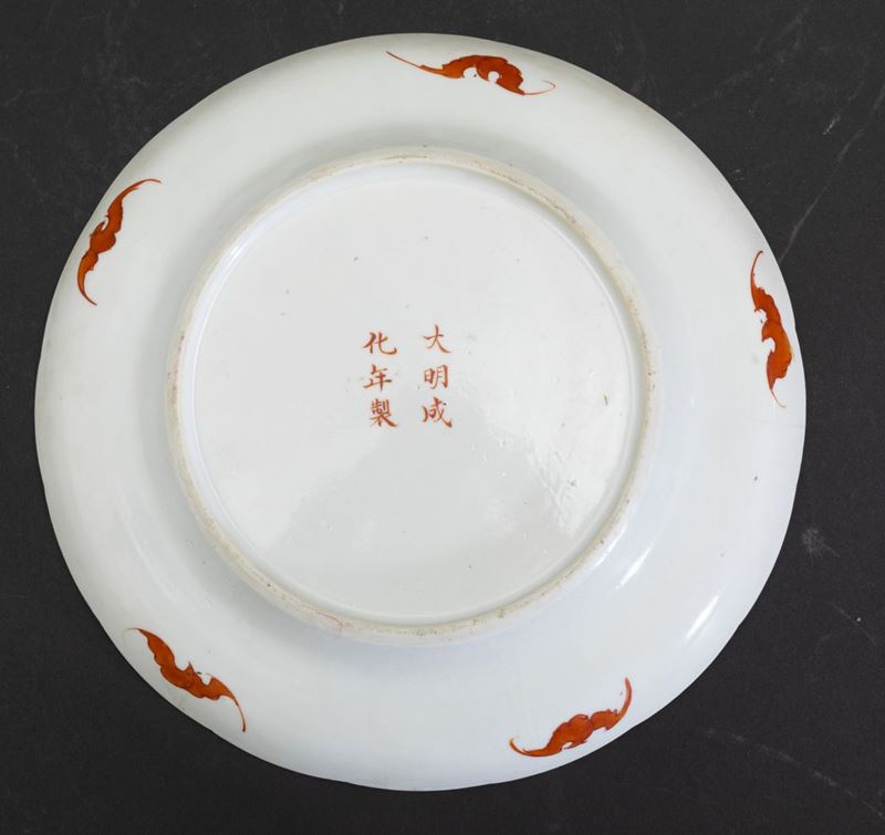 Piatto in porcellana a smalti policromi con decoro di pesche e melograni e figure di pipistrelli e simboli, Cina, Dinastia [..]