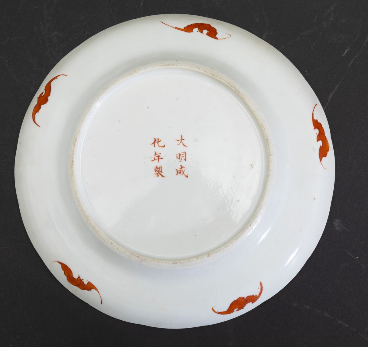 Piatto in porcellana a smalti policromi con decoro di pesche e melograni e figure di pipistrelli e simboli, Cina, Dinastia Qing, epoca Xianfeng (1851-1861)