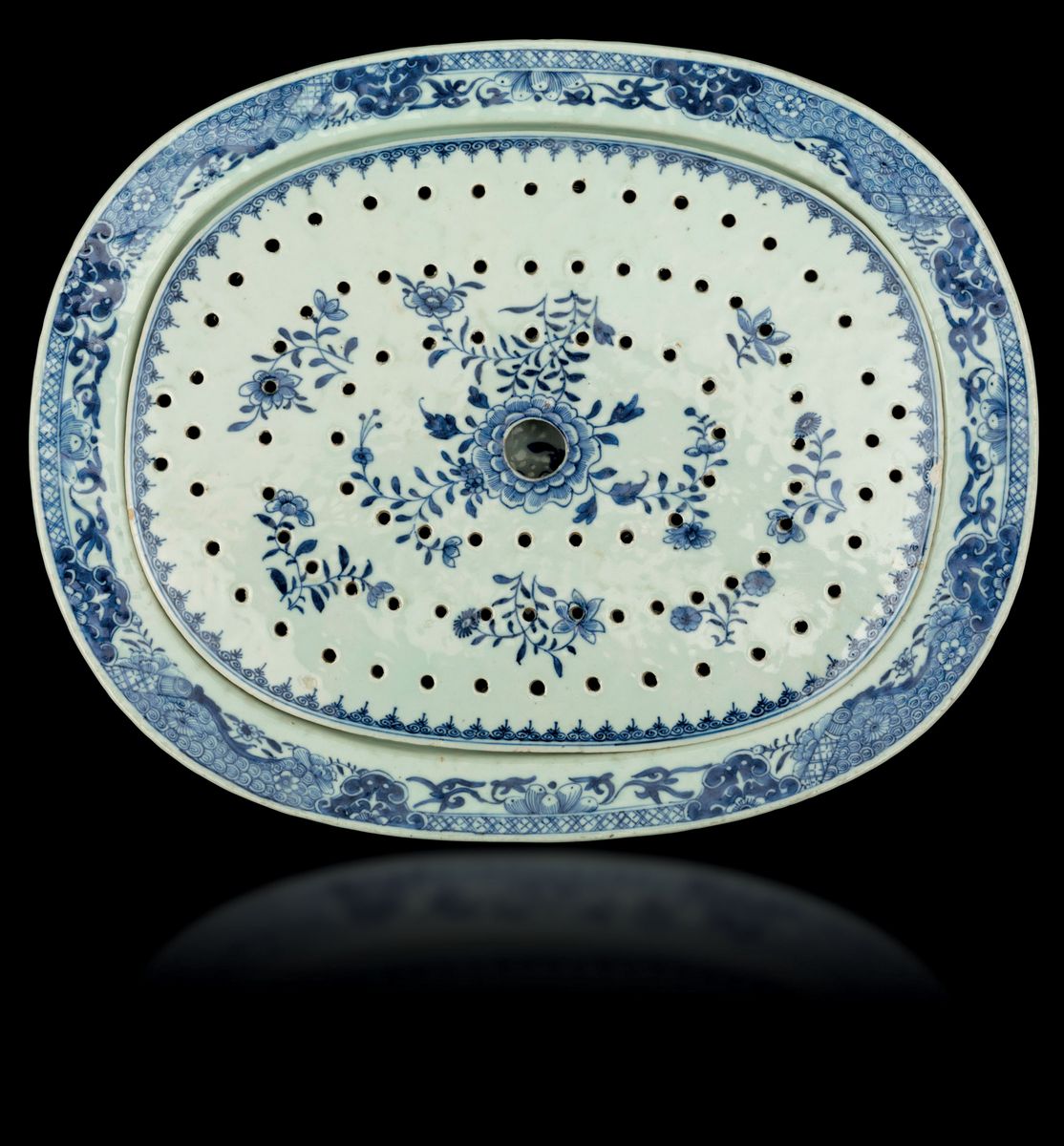 Portavivande ovale in porcellana bianca e blu con decoro floreale sui toni del blu, Cina, Dinastia Qing, epoca Qianlong [..]