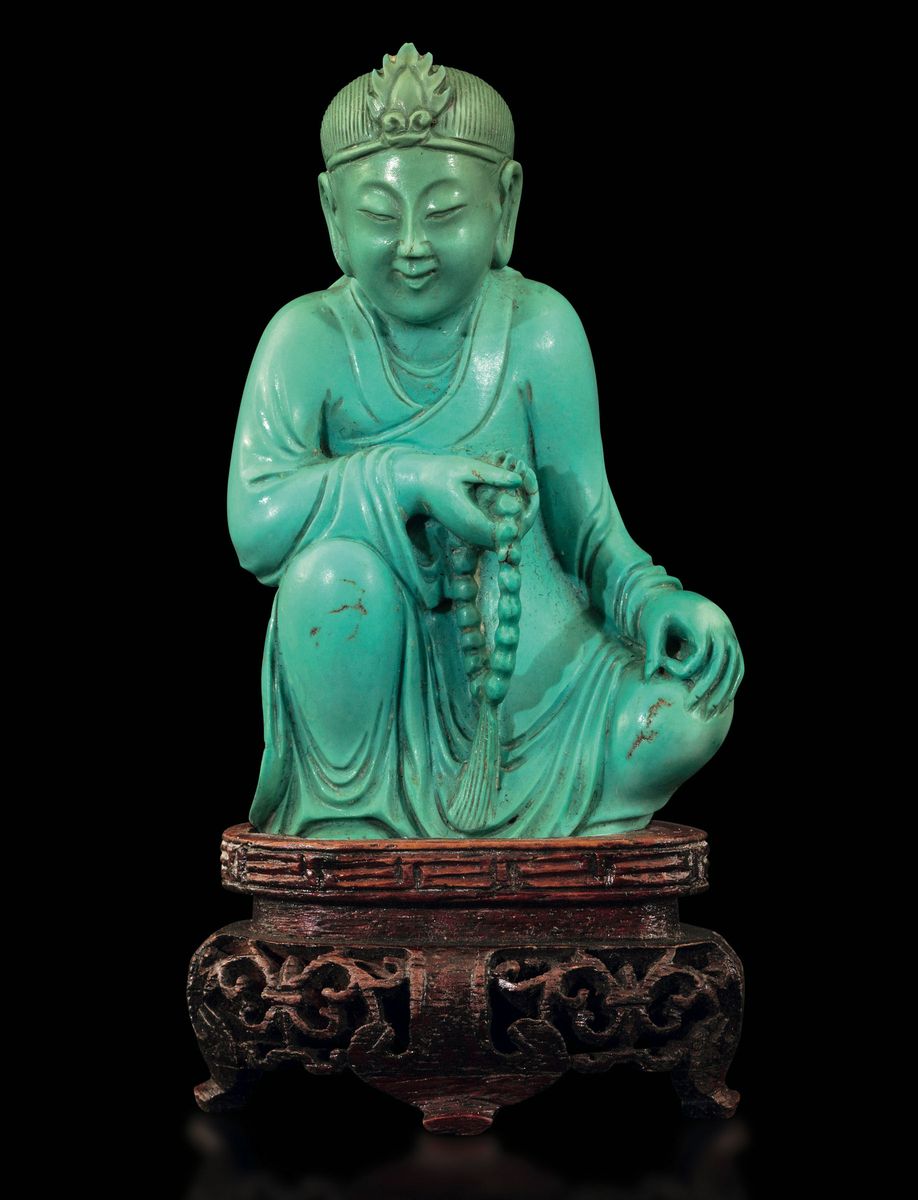 Rara figura di saggio con collana da preghiera scolpita in turchese, Cina, Dinastia Qing, epoca Qianlong (1736-1796)