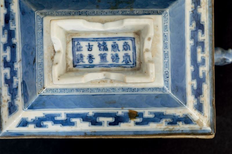 Rara scatola portavivande con coperchio e vasca interna in porcellana bianca e blu con decoro d'ispirazione arcaica e anse a foggia di testa di drago, Cina, Dinastia Qing, epoca Daoguang (1821-1850)