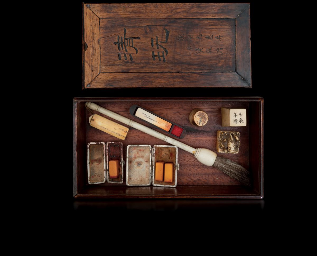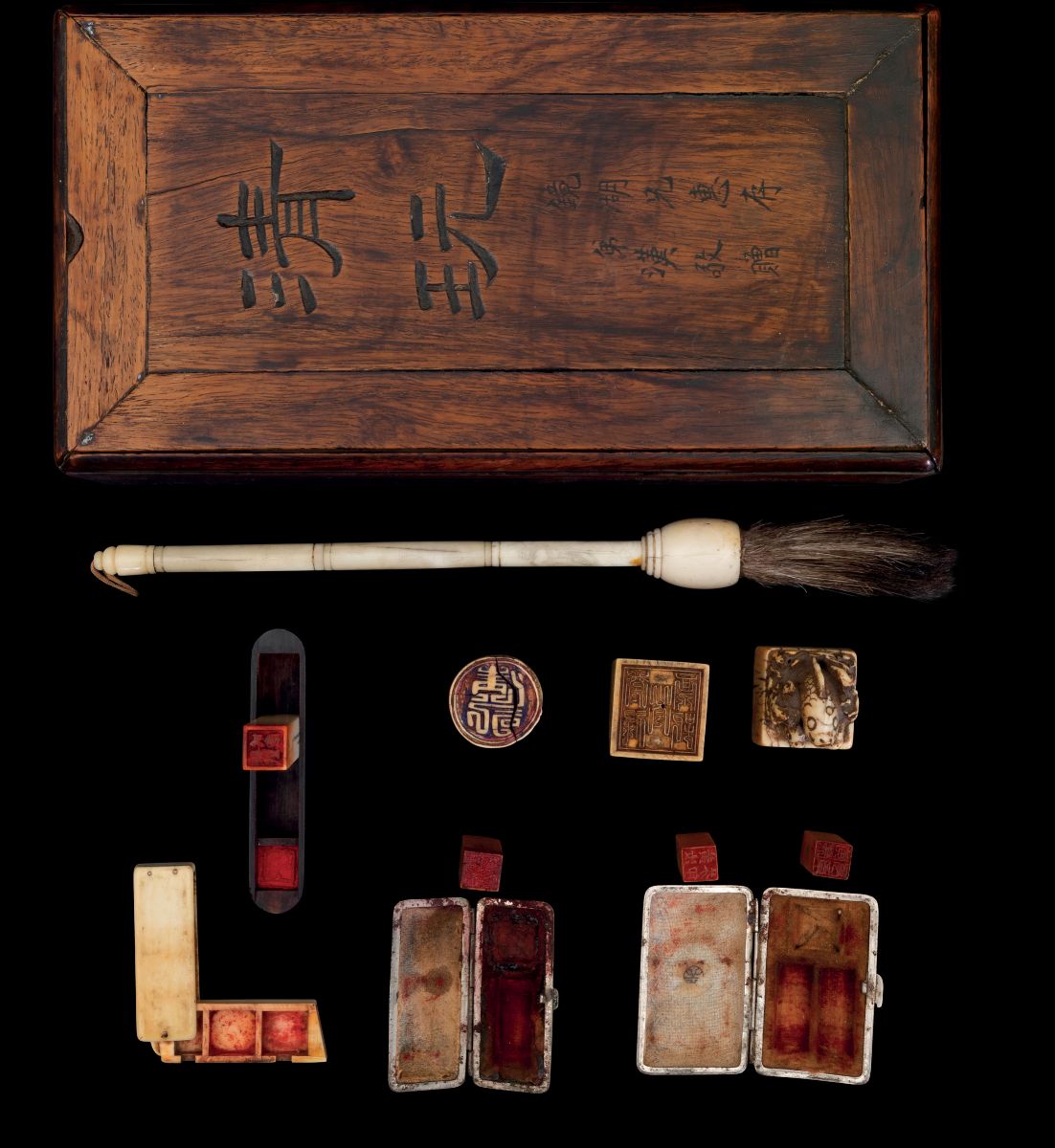 Scatola in legno con iscrizione incisa contenente pennello e sette sigilli in avorio e in pietra di Tianhuang, Cina, Dinastia [..]