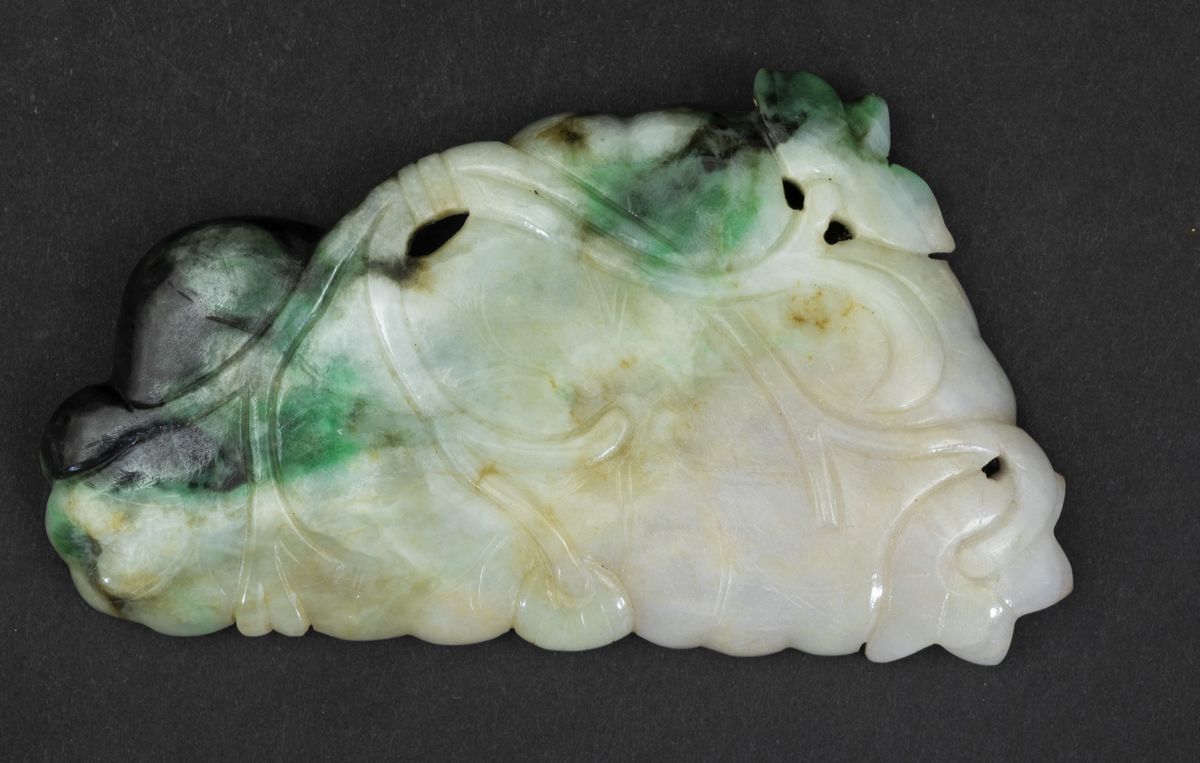 Sciacquapennelli scolpito in giadeite a foggia di foglia con elementi vegetali a rilievo, Cina, inizi XX secolo