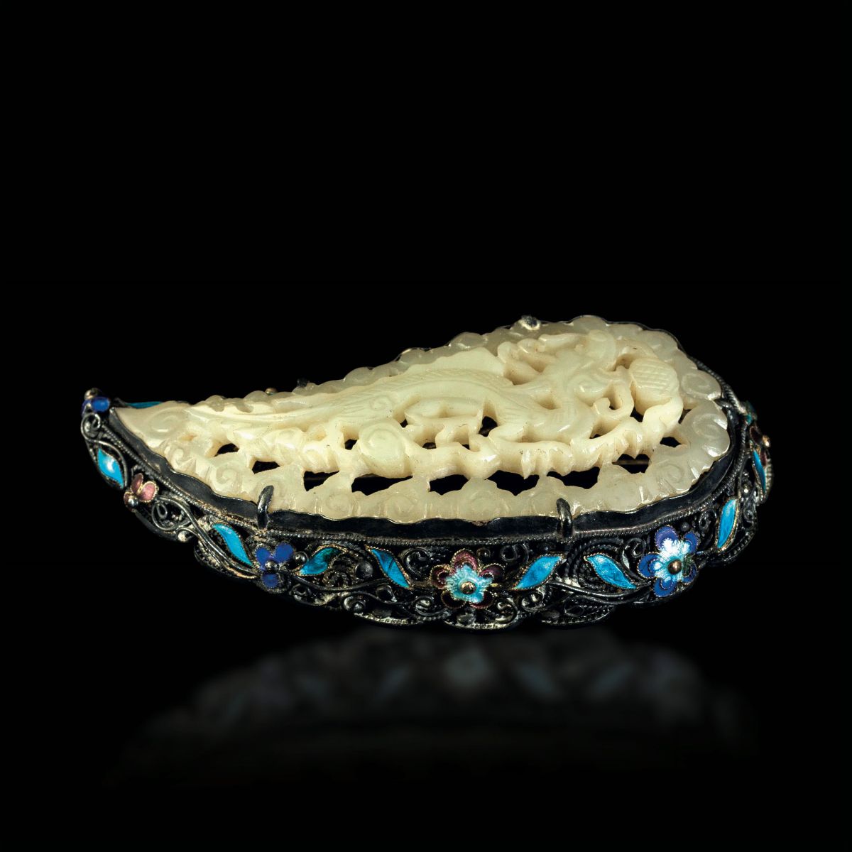 Spilla in filigrana di argento con placca in giada celadon raffigurante draghetto e dettagli in smalto, Cina, Dinastia Qing, [..]