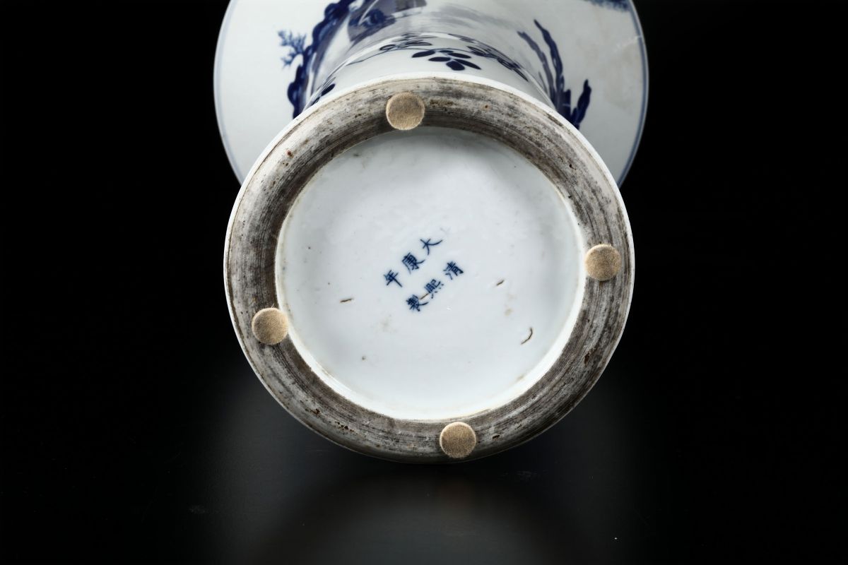 Vaso a tromba in porcellana bianca e blu con scene di vita comune entro paesaggio e decori floreali, Cina, Dinastia Qing, [..]