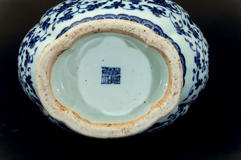Vaso in porcellana bianca e blu a doppia ansa con decoro a fiori di loto, Cina, Dinastia Qing, XIX secolo