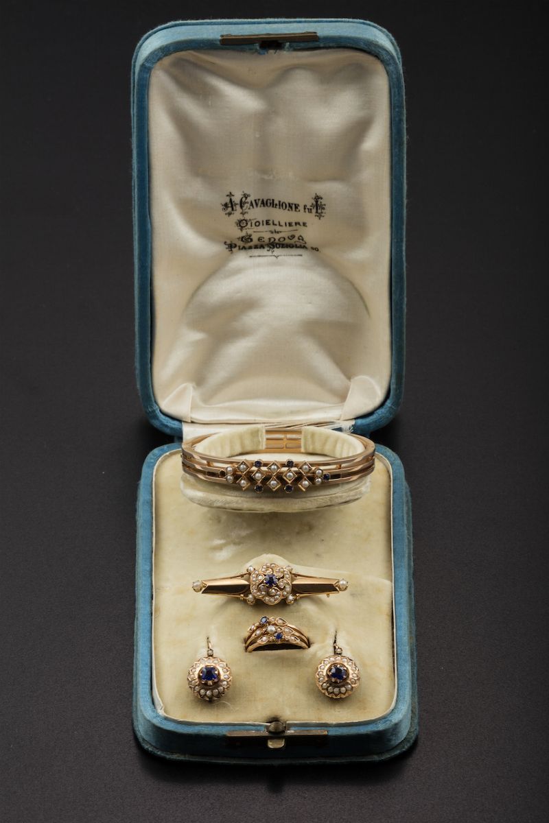 Parure composta da bracciale rigido, orecchini, spilla ed anello con piccole perle e vetri blu