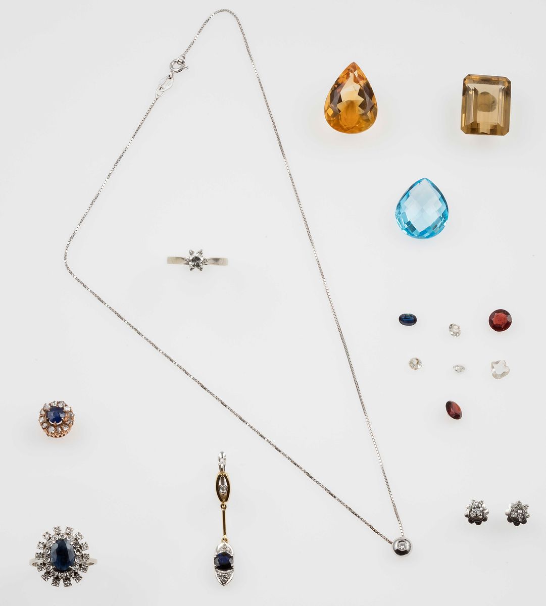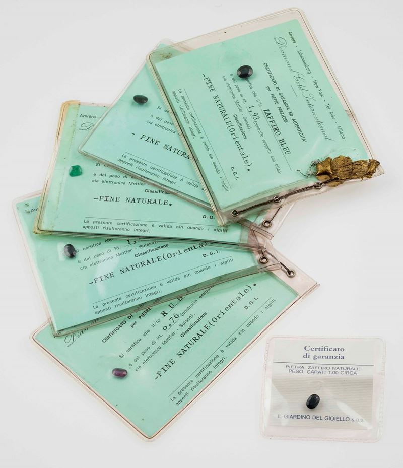Lotto composto da un anello con zaffiro e diamanti a contorno, due orecchini spaiati con zaffiri e diamanti, una demi-parure composta da orecchini ed anello con diamanti, un girocollo con un piccolo diamante, un lotto composto da 10 pietre sciolte ed un lotto di 6 gemme sigillate