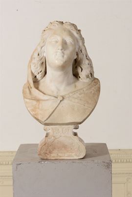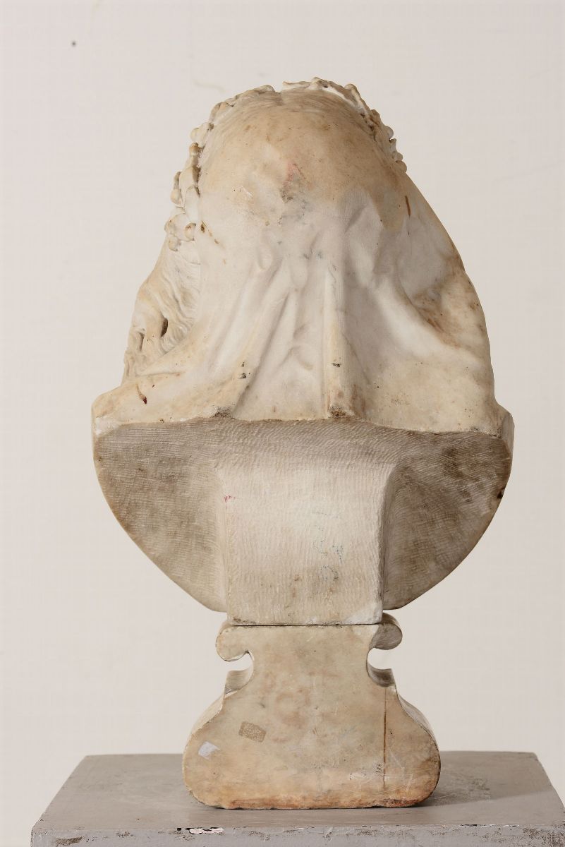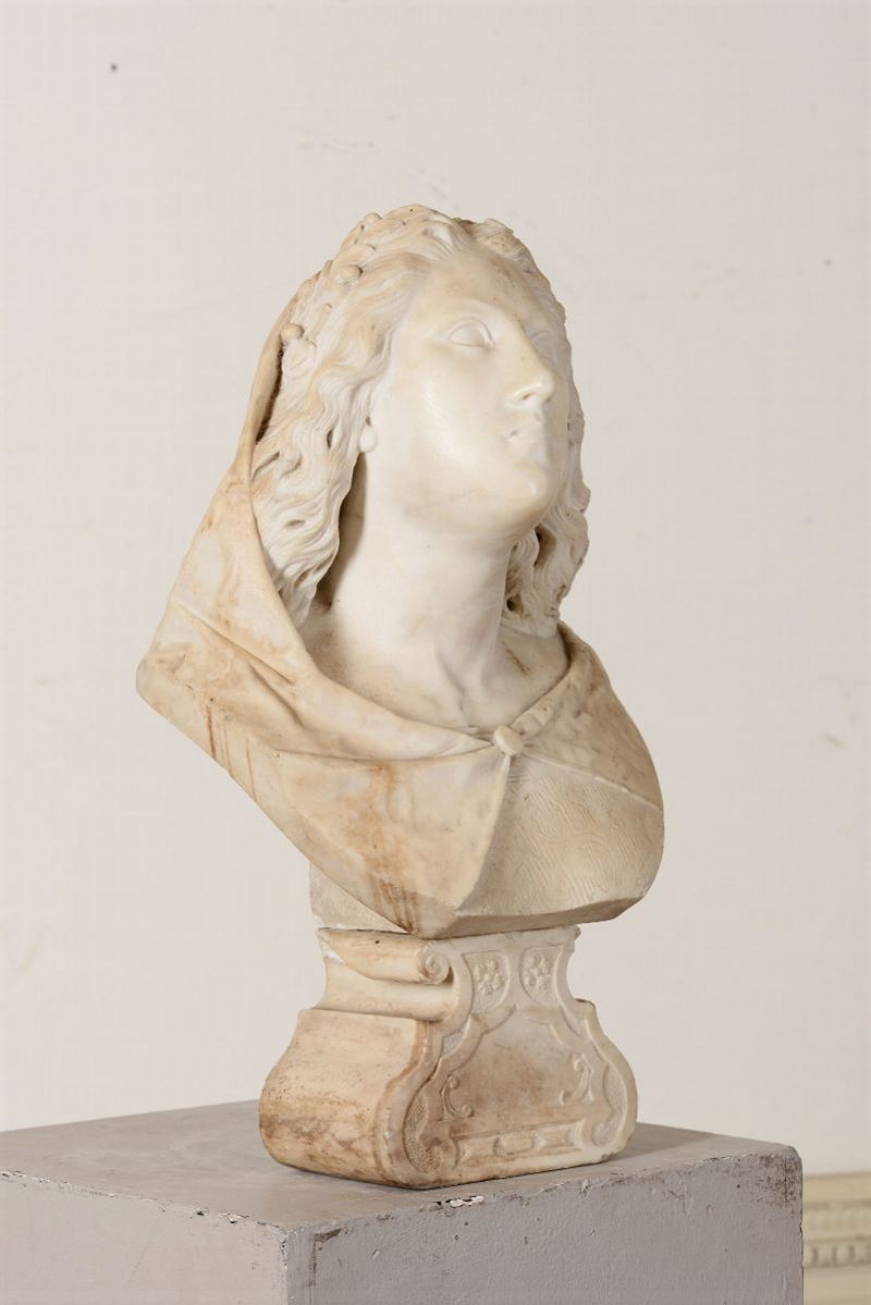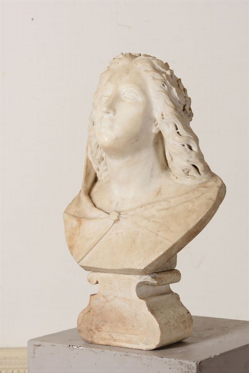 Busto femminile (Musa?) in marmo bianco. Italia XVII secolo. Scultore barocco di matrice algardiana