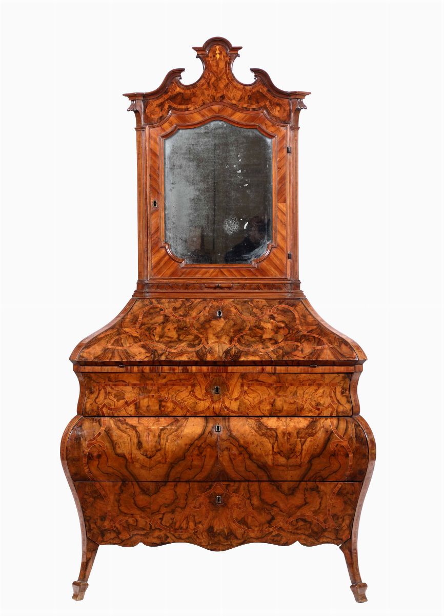 interamente lastronato in noce, radica di noce e impreziosito da riserve mistilinee intarsiate in legni diversi. Fronte e fianchi mossi, tre cassetti sagomati di cui uno più sottile sotto la fascia, anta a ribalta celante scarabattolo con quattro cassettini intarsiati e filettati in essenze pregiate, alzata ad un'anta a specchio con cimasa a timpano spezzato, cm 125x58x226