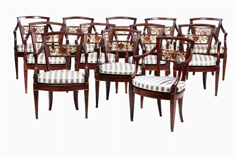 composto da divano e dodici poltrone, schienale con decoro intagliato, traforato e dorato a motivo fogliaceo con scudo centrale, gambe anteriori troncopiramidali e posteriori arcuate. Divano cm 202x52x88; poltrona cm 57x47x88