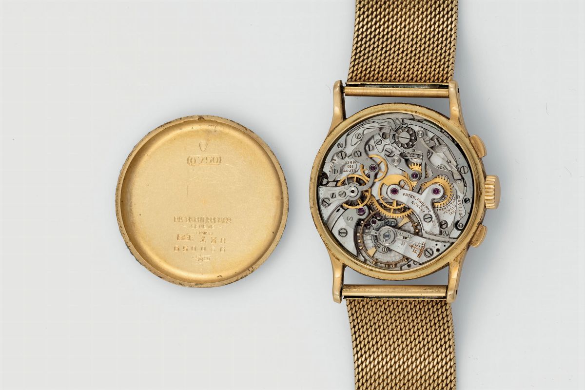 PATEK PHILIPPE & Co., Genève, cassa No. 650066. Ref. 130. Orologio da polso, cronografo in oro giallo con bracciale in [..]