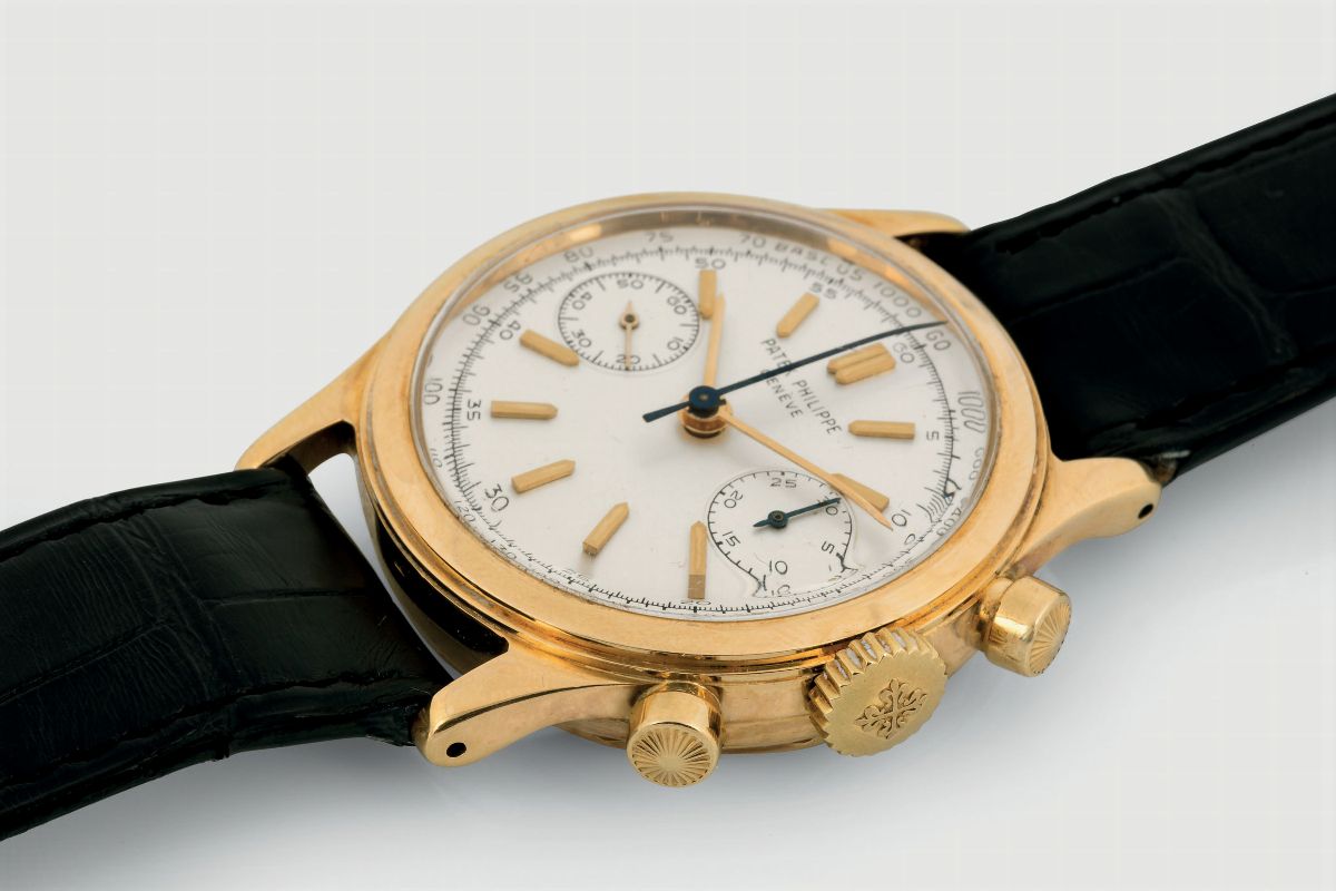 PATEK PHILIPPE, Genève, No. 869182, cassa No. 2647868 , Ref. 1463. Raro, orologio da polso, in oro giallo 18K con cronografo [..]