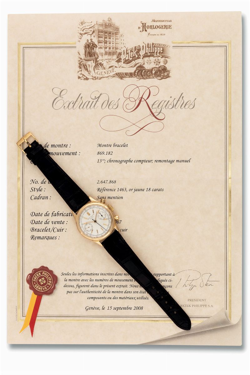 PATEK PHILIPPE, Genève, No. 869182, cassa No. 2647868 , Ref. 1463. Raro, orologio da polso, in oro giallo 18K con cronografo e fibbia originale in oro. Accompagnato dall'Estratto degli Archivi. Realizzato nel 1966 circa