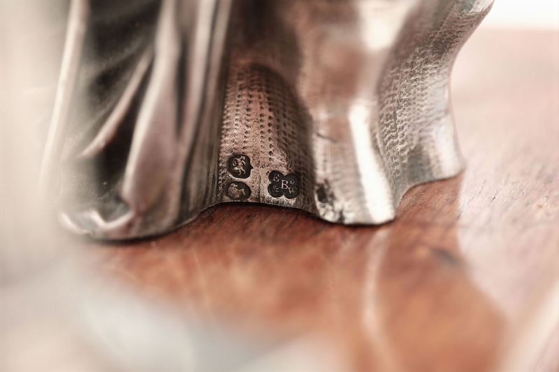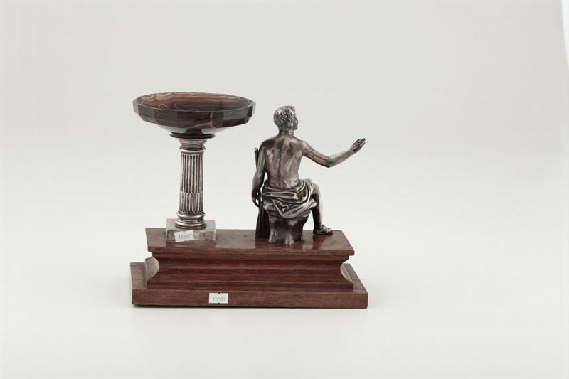 Composizione in argento fuso e cesellato composta da coppa con bolli della città di Sheffield 1901 e dell'argentiere J.R(non identificato) e figura classica con bolli della città di Londra, fine XIX secolo e dell'argentiere EJ & BW (non identificato)
