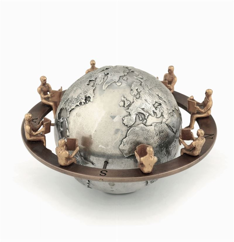 Globo terrestre in argento e bronzo fuso e cesellato. Manifattura artistica Italiana del XX secolo