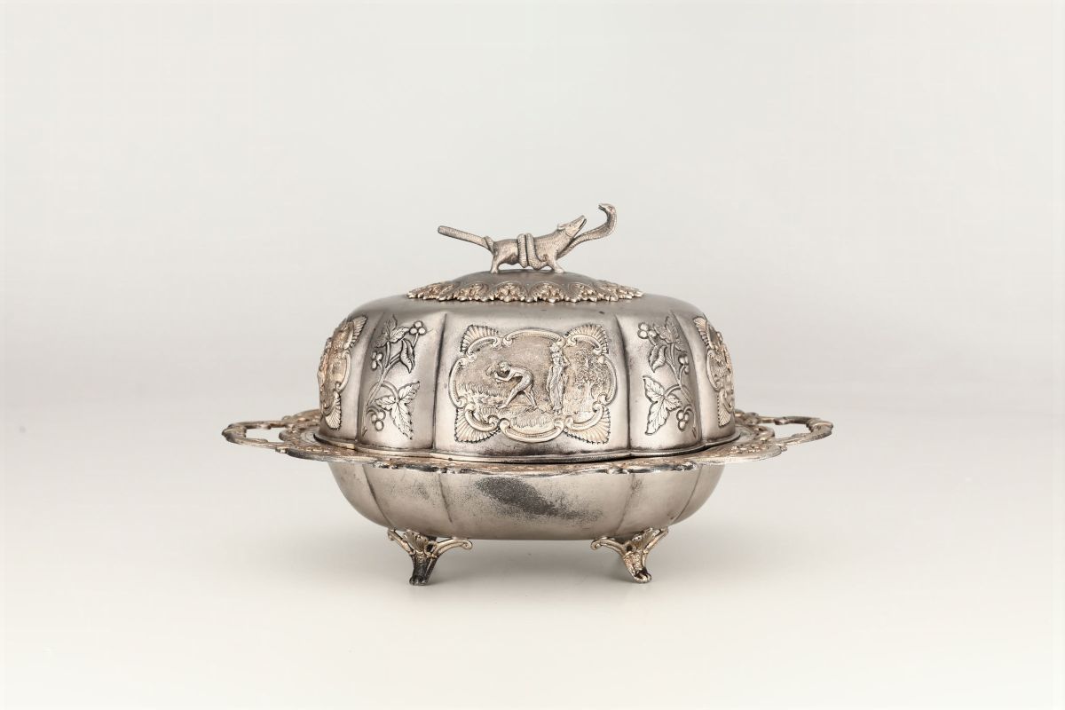 corpo ovale baccellato con manici laterali, coperchio con riserve contenenti scene agresti e singolare presa raffigurante la lotta tra il cobra e la mangusta