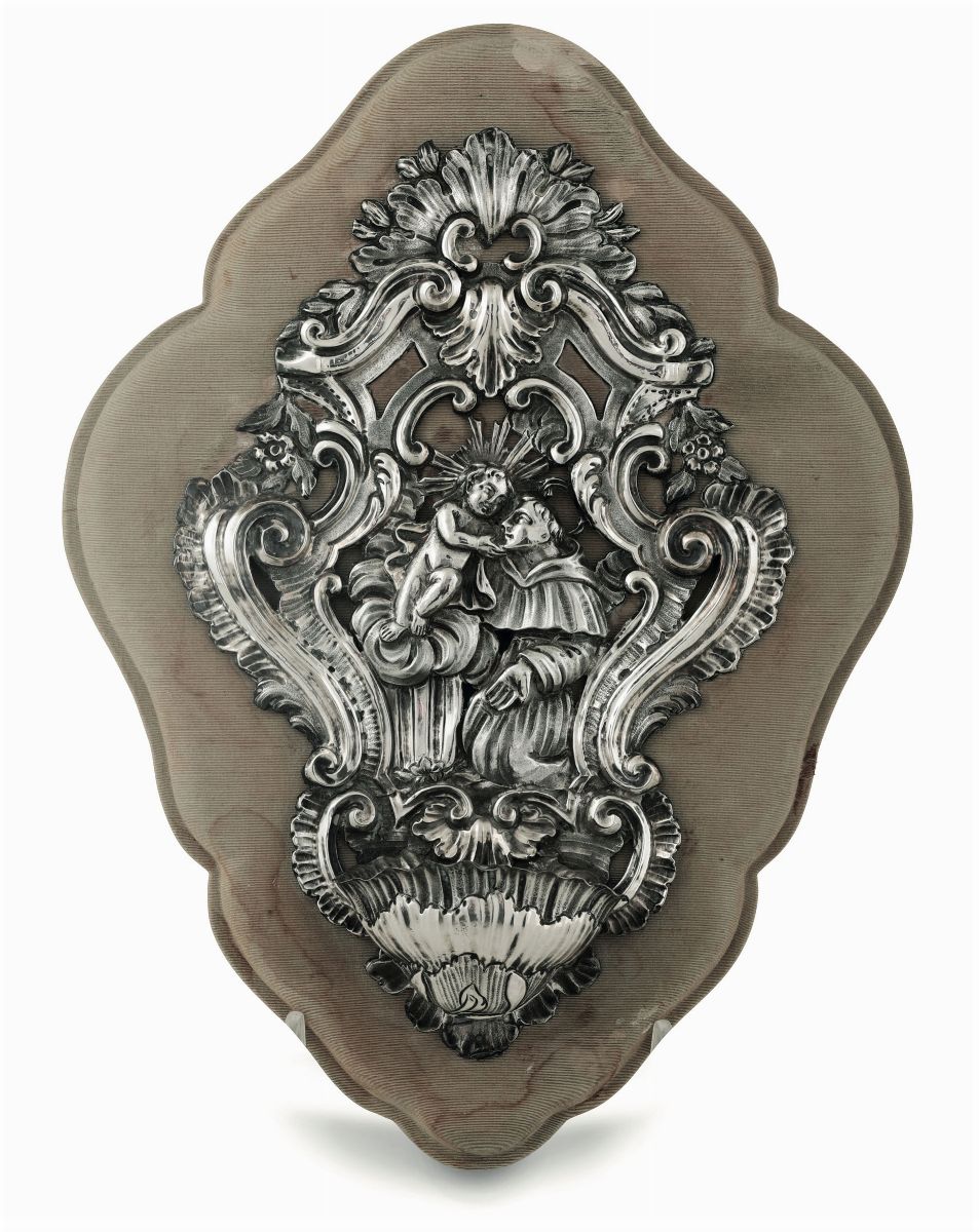 Acquasantiera in argento sbalzato e cesellato Genova, seconda metà del XVIII secolo, bollo della Torretta con data consun [..]