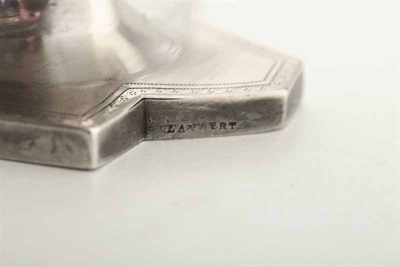 forma piriforme baccellata su base polilobata, sul bordo incisa la scritta Lambert sul corpo stemma con monogrammi