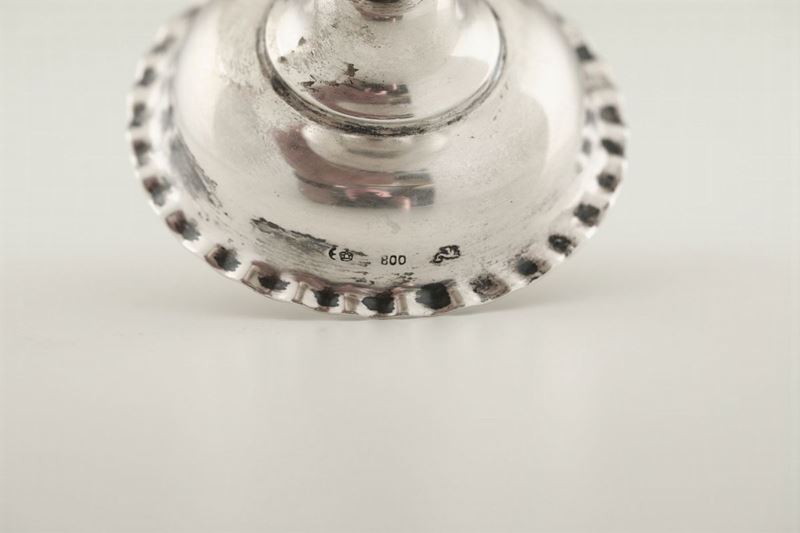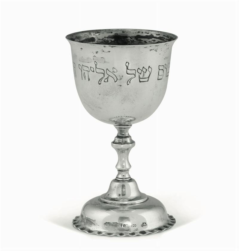 piede circolare gradinato con bordo ondulato e fusto a balaustro. Sulla coppa iscrizione in lingua ebraica