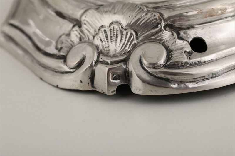 piede sagomato lievemente bombato, fusto a balaustro con volute, su modello dell'argenteria barocca napoletana del XVIII secolo