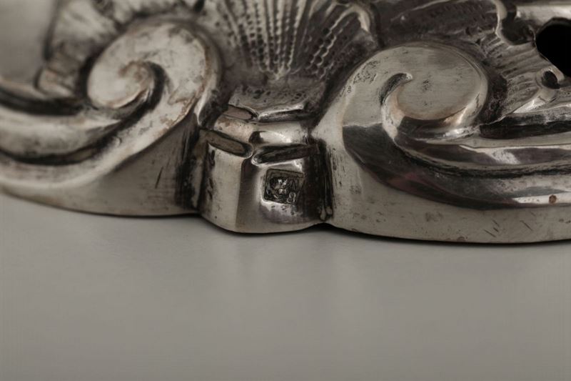 Coppia di candelieri in argento fuso, sbalzato e cesellato. Napoli, probabile XIX secolo, marchio di titolo utilizzato dal 18 febbraio 1832 al 31 maggio 1873