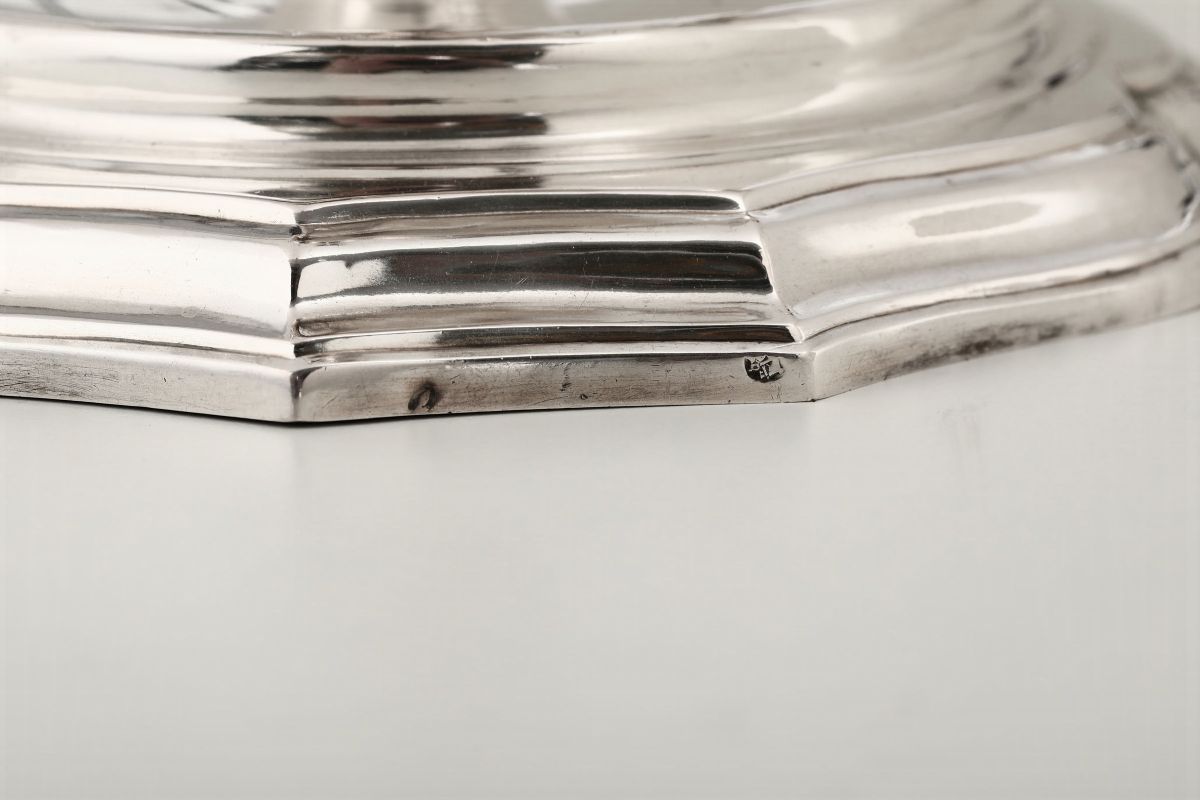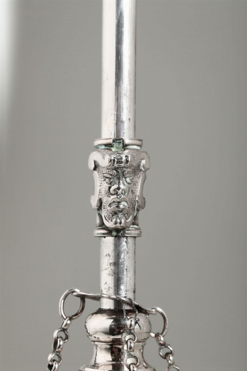Coppia di lucerne in argento fuso, sbalzato e cesellato Roma, ultimo quarto del XVIII secolo, bollo camerale (biennio 1787-1789) [..]
