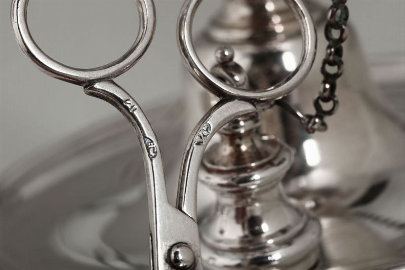 piede circolare sagomato e gradinato, fusto sagomato e costolato, portaolio a tre beccucci e presa sagomata a volute. All’asta sono appese tre catenelle con pinzette, smoccolatoio e spengi-fiamma