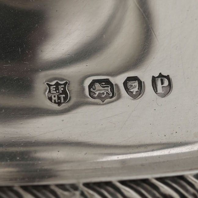 Coppia di piccoli candelieri in argento fuso, sbalzato e cesellato Londra 1890, bollo dell'argentiere E.F.A.T. entro scudo non identificato