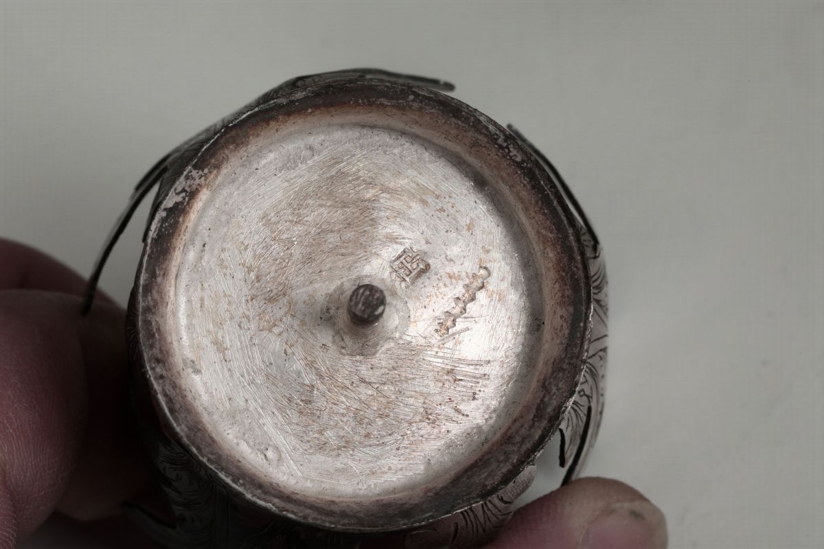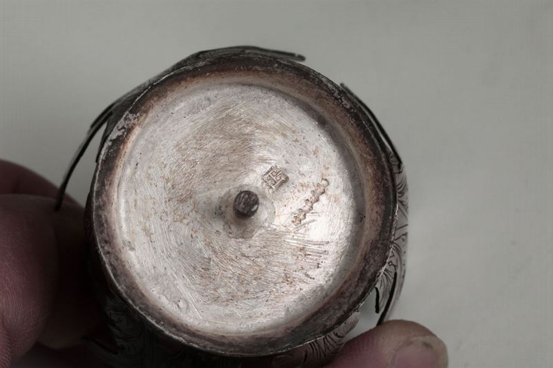 Coppia di trembleuse in argento sbalzato e cesellato, tazza e piattino in porcellana Genova, seconda metà del XVIII secolo, [..]