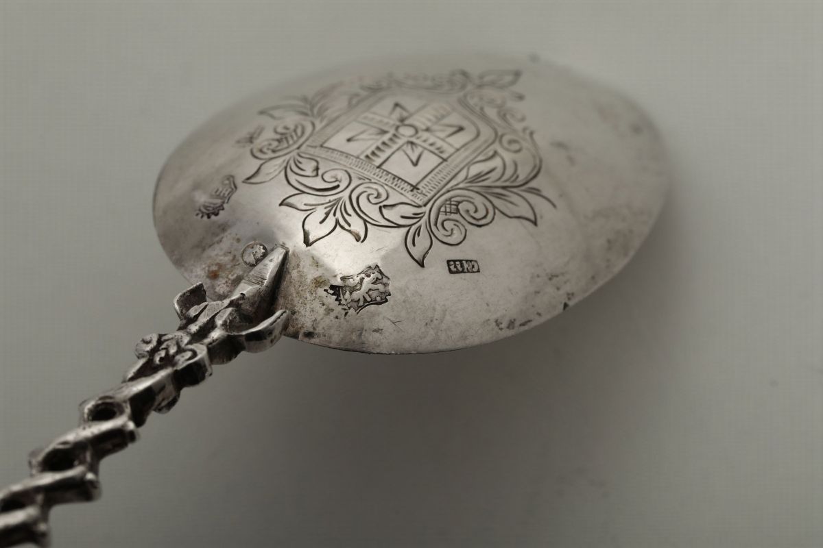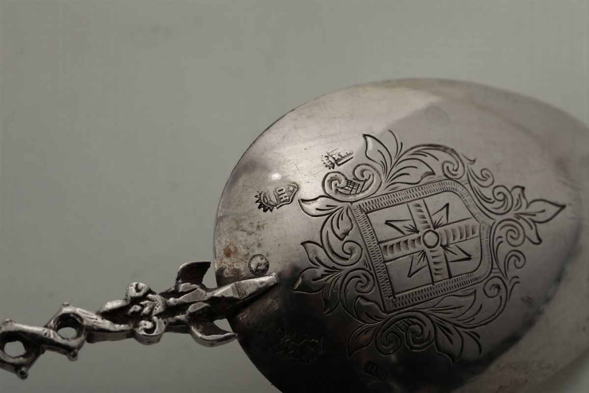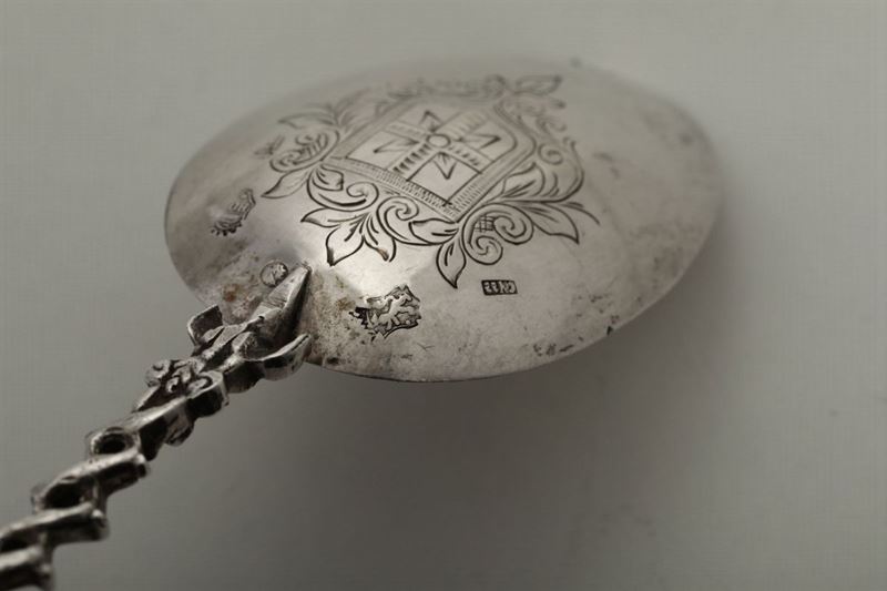 Due cucchiai da cerimonia in argento fuso, sbalzato e cesellato Paesi Bassi probabile XX secolo