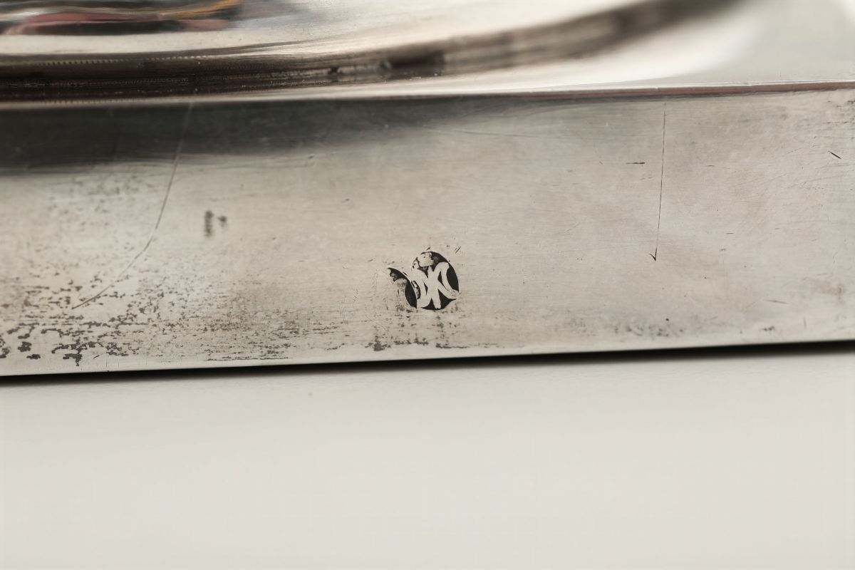 piede circolare poggiante su base quadrata e corpo ovale decorato con tralci d'uva, versatoio a collo di cigno che si diparte da un mascherone, presa del coperchio a forma vegetale e manico in legno. Sul corpo applicato stemma sormontato da corona “d’oro alla banda ondata d’azzurro”