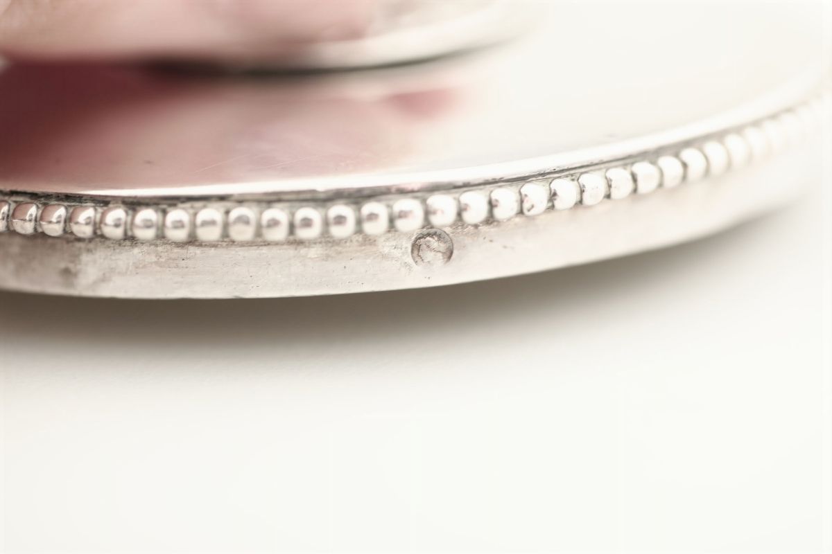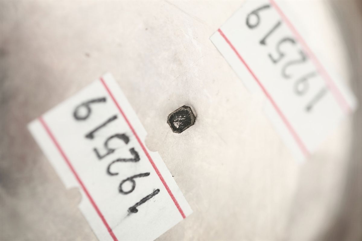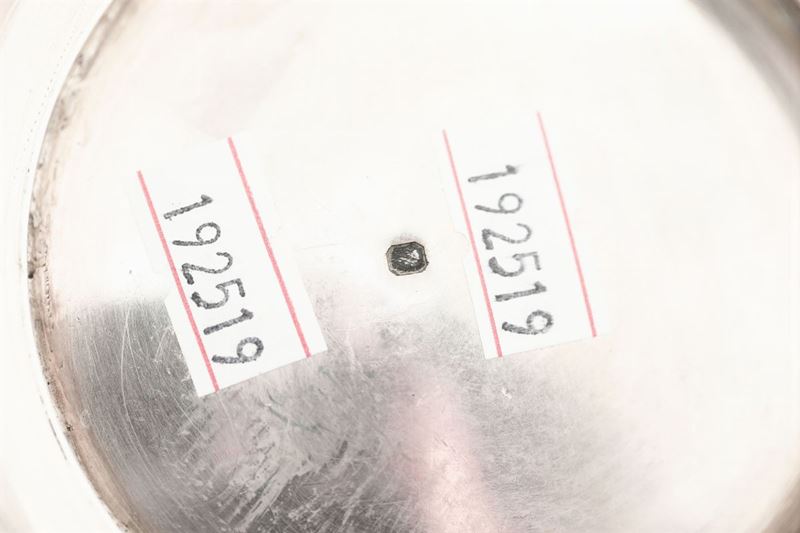 corpo globulare con decori di gusto impero a foglie e perlinato. Al centro fascia con raffigurati disegni, manico in ebano finemente intagliato a foggia di festone di frutta e fiori
