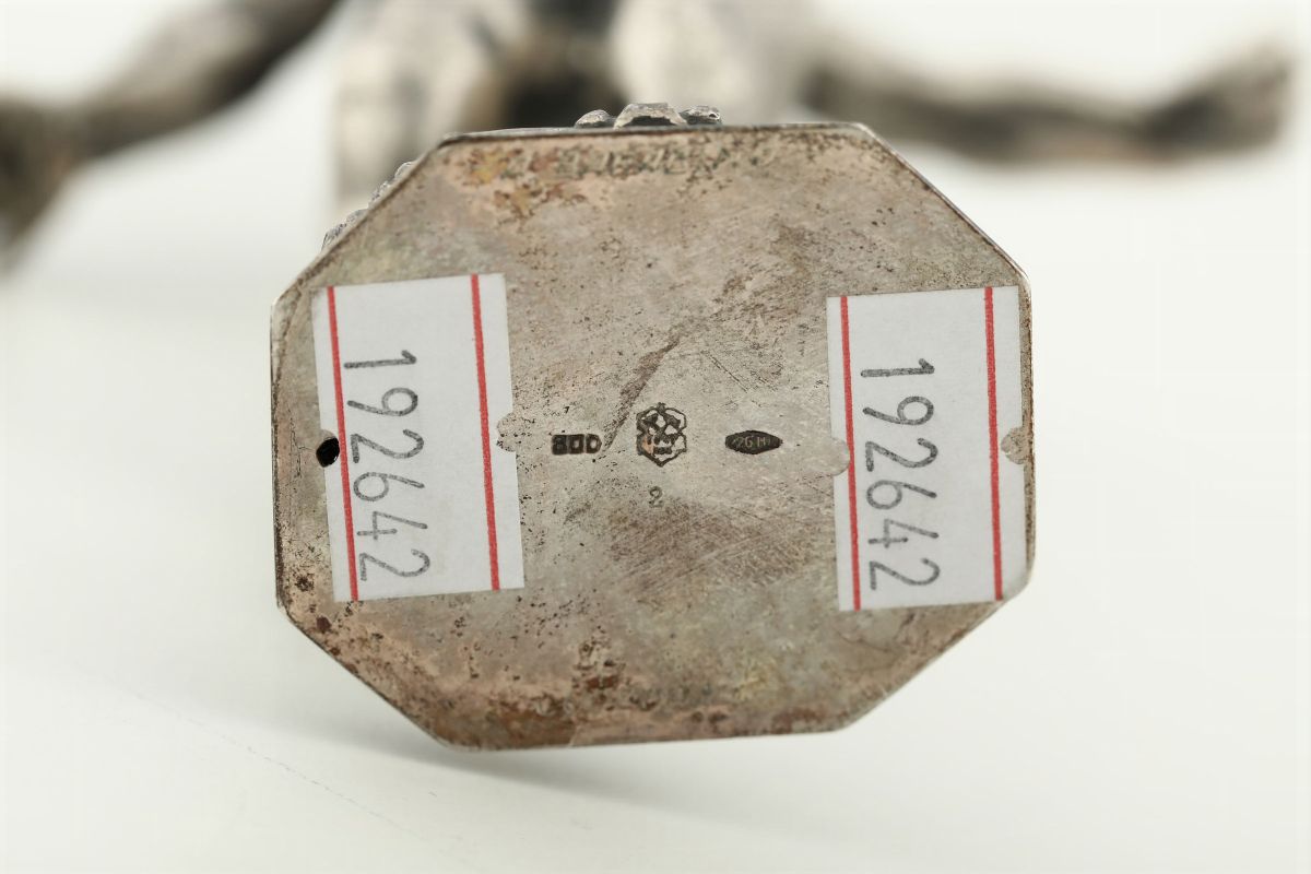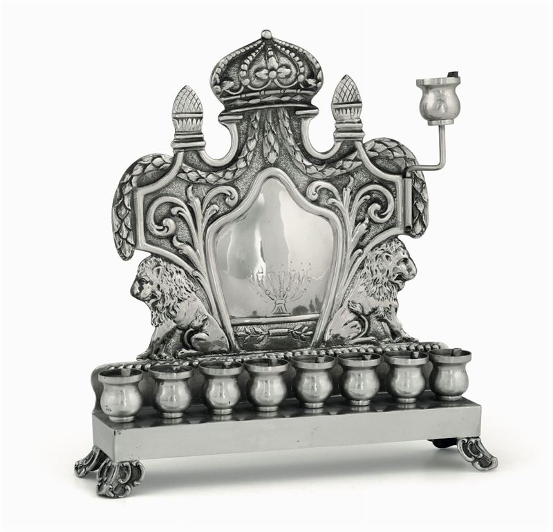 Lampada per Hanukah in argento sbalzato e cesellato argenteria ebraica europea del XX secolo (apparentemente priva di pun [..]
