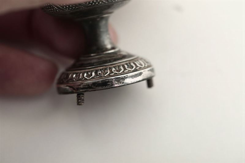 Piccolo calamaio in argento fuso, sbalzato e cesellato manifattura lombarda del XIX secolo, contrassegno per il titolo dell’argento