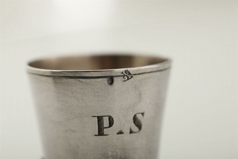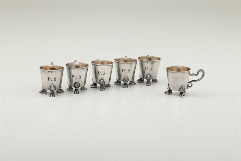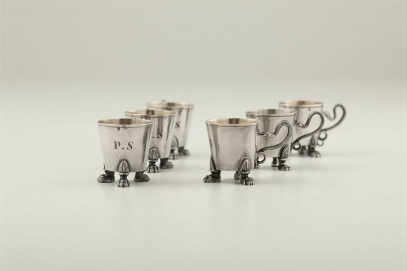 Sei bicchierini in argento fuso, sbalzato, cesellato e in parte dorato Roma, primo quarto del XIX secolo, bollo camerale (in uso dal 1815) e marchio dell’argentiere Paolo Marianecci (attivo dal 1819 al 1824)