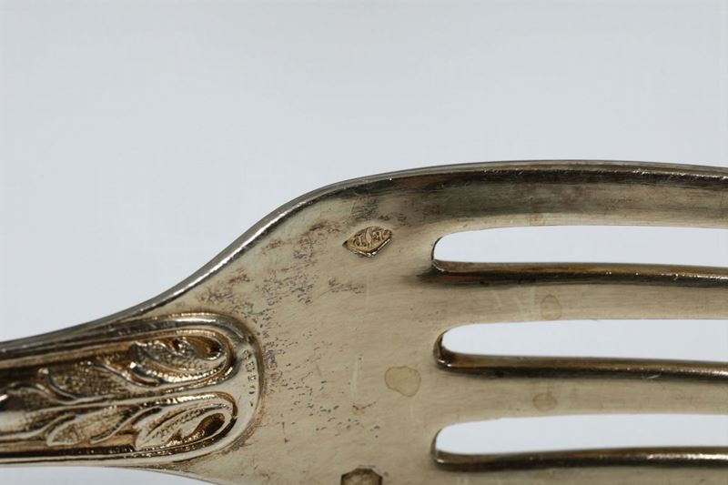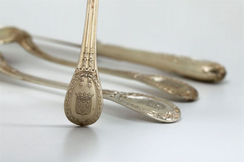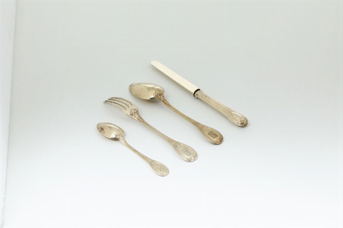 Servizio di posate in argento cesellato e dorato composto da 162 pezzi. Parigi seconda metà del XIX secolo. Forchette, cucchiai [..]