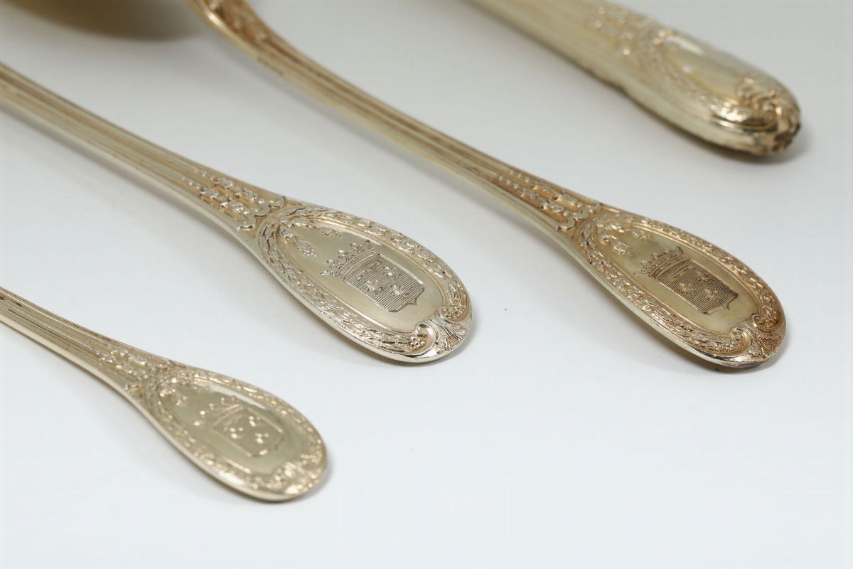 Servizio di posate in argento cesellato e dorato composto da 162 pezzi. Parigi seconda metà del XIX secolo. Forchette, cucchiai e cucchiaini Argentiere Emile Puiforcat. Coltelli argentiere Eduard Corvasier
