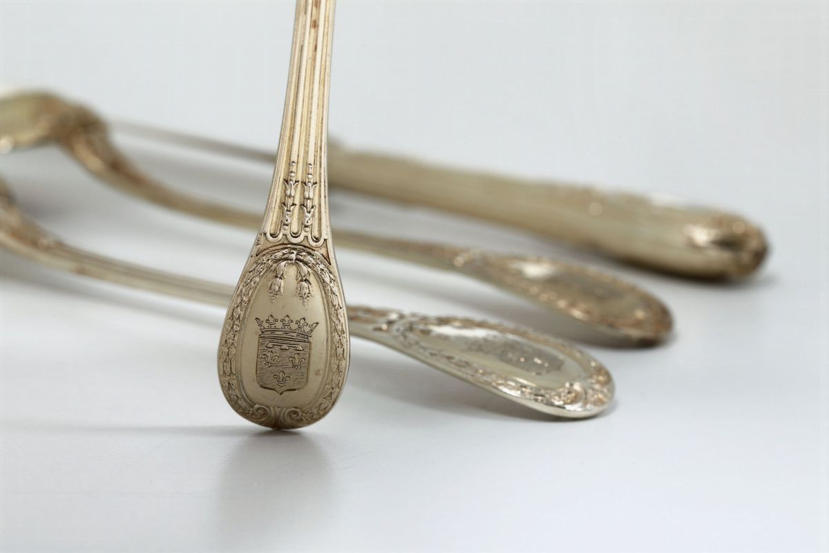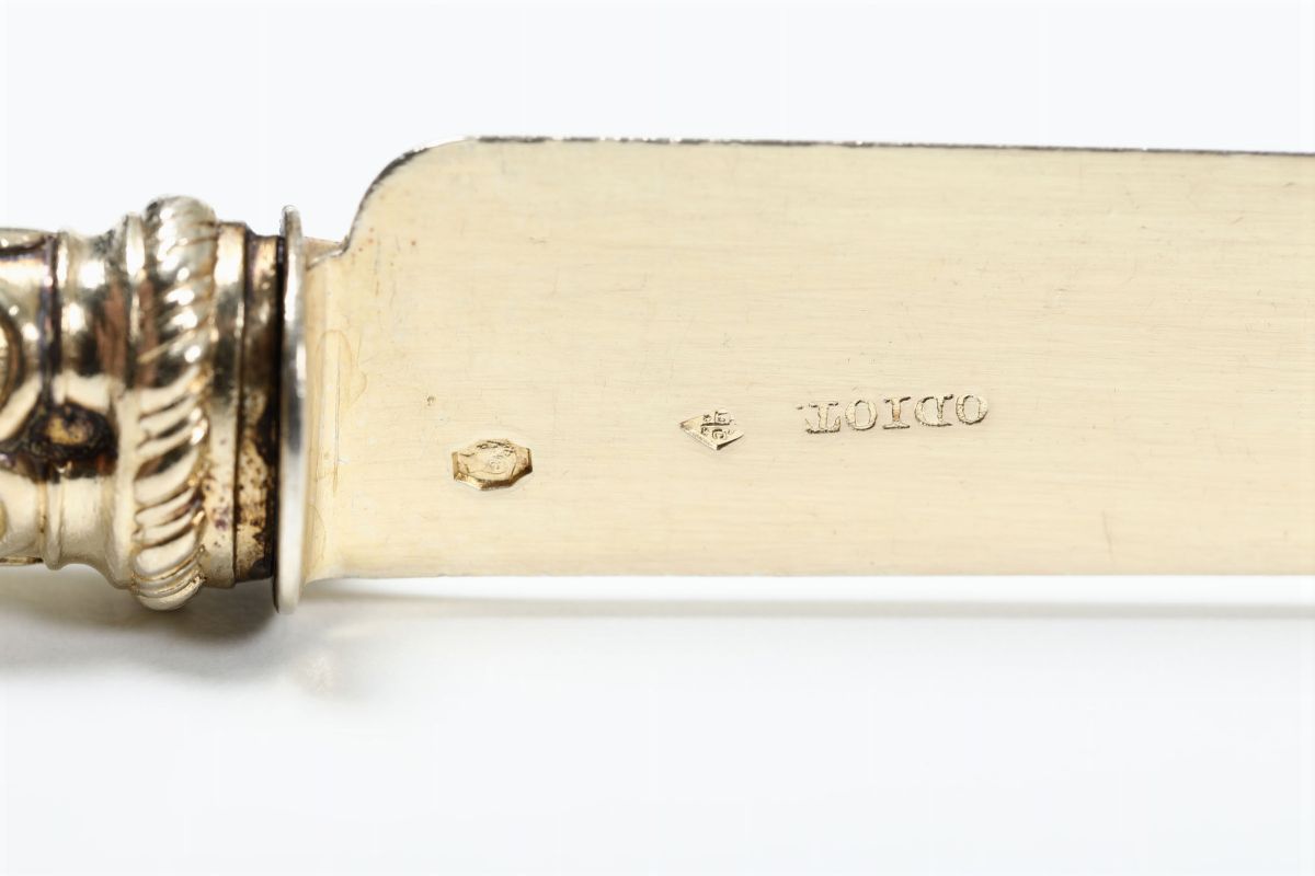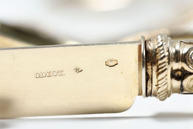 I coltelli recano incusso sulle lame il marchio della maison Odiot che li ha posti in commercio. Raffinato servizio da tavolo elegantemente decorato con motivi di gusto neoclassico. Sui manici è inciso stemma della nobile casata Valois-Orleans