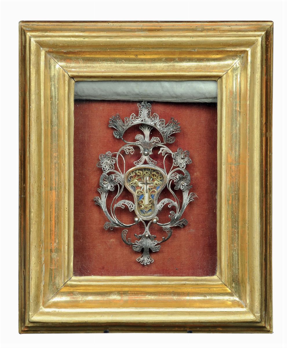 Teca in legno sagomato e dorato con pendente reliquiario in filigrana, celabile da tendina in seta con ricami di simboli della Passione Italia XVIII secolo