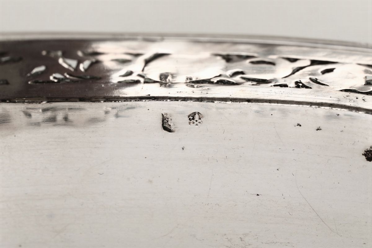 Vassoio in argento fuso, cesellato e traforato. Stato Pontificio, fine del XVIII secolo – inizio del XIX secolo. Bollo camerale e marchio dell’argentiere non identificato.