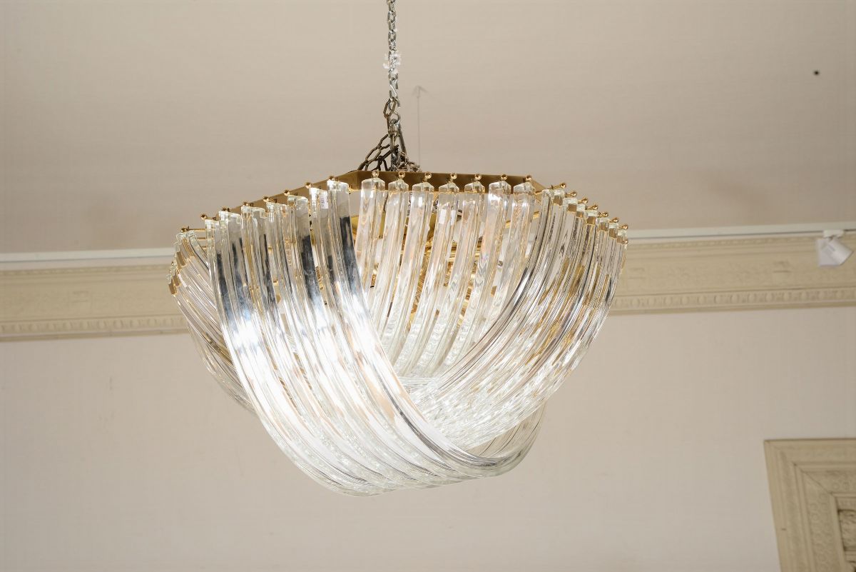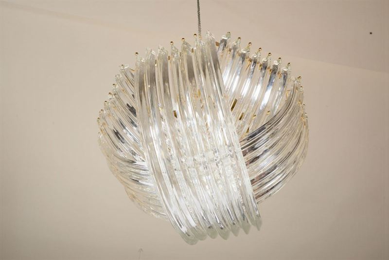 Lampada a sospensione con struttura in metallo e diffusori in vetro di Murano.