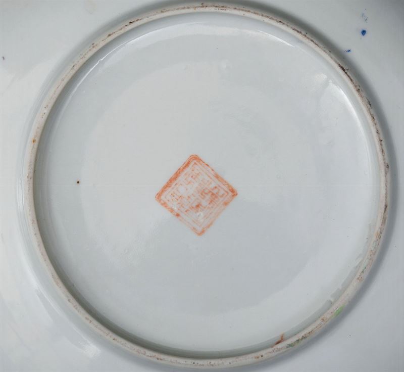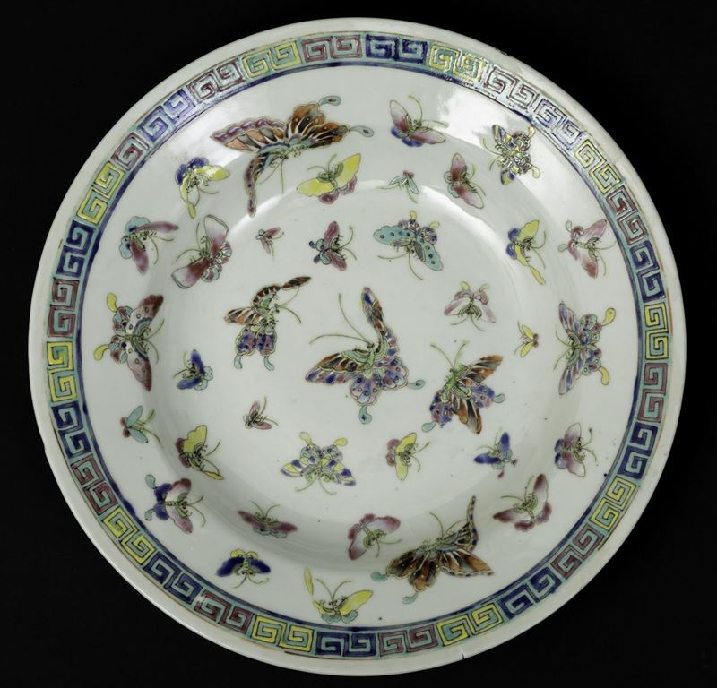 Cinque piatti in porcellana a smalti policromi con decori di farfalle, Cina, XX secolo