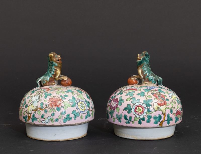 Coppia di coperchi in porcellana famiglia Rosa con presa a foggia di Cani di Pho, Cina, Dinastia Qing, XIX secolo